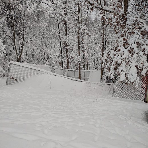 Third, trees had fallen across our driveway, and none of our cars could make it down the hill anyway. I had intended to buy a 4WD for this reason earlier this year, but, well, life happened, and anyway prices have been outrageous. I gambled we could make it through one winter without needing it, and I lost. I also cheaped out on an off-brand chainsaw which broke down immediately, so I had to hike to the neighbors for their Husqvarna.