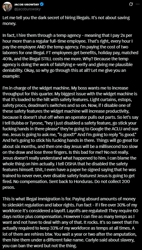 It doesn’t matter how gritty and hard-working an immigrant is — if you are required by law to provide them with healthcare, pay for their sick leave, compensate them when they’re injured, etc. — they’ll cost about the same as an American worker.